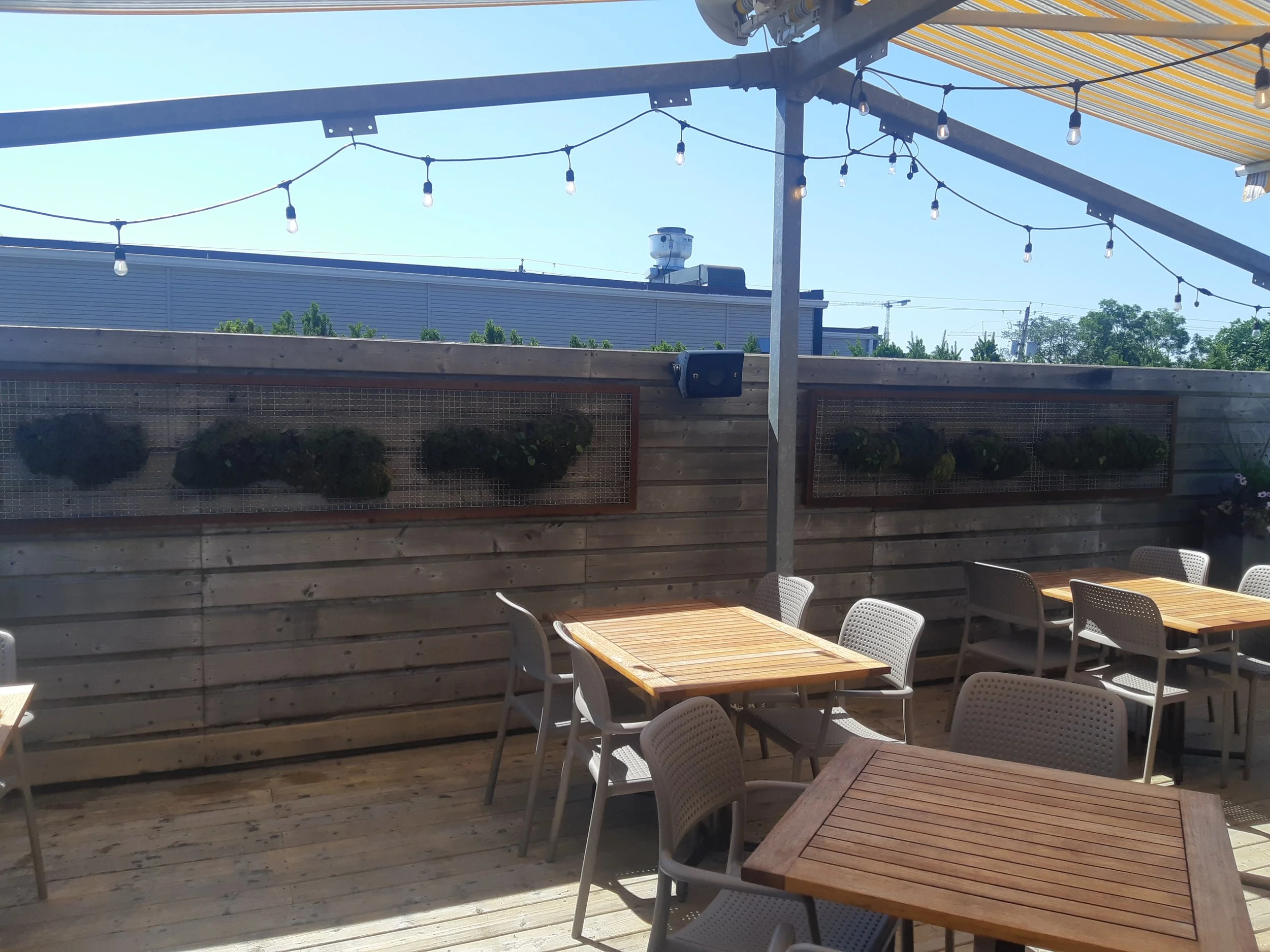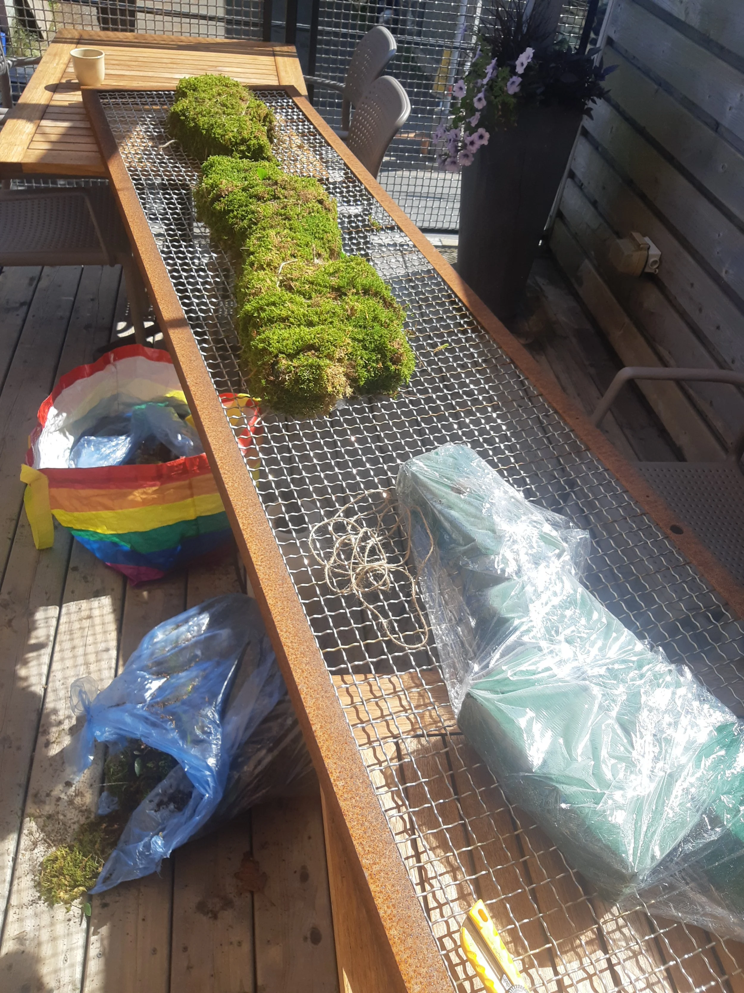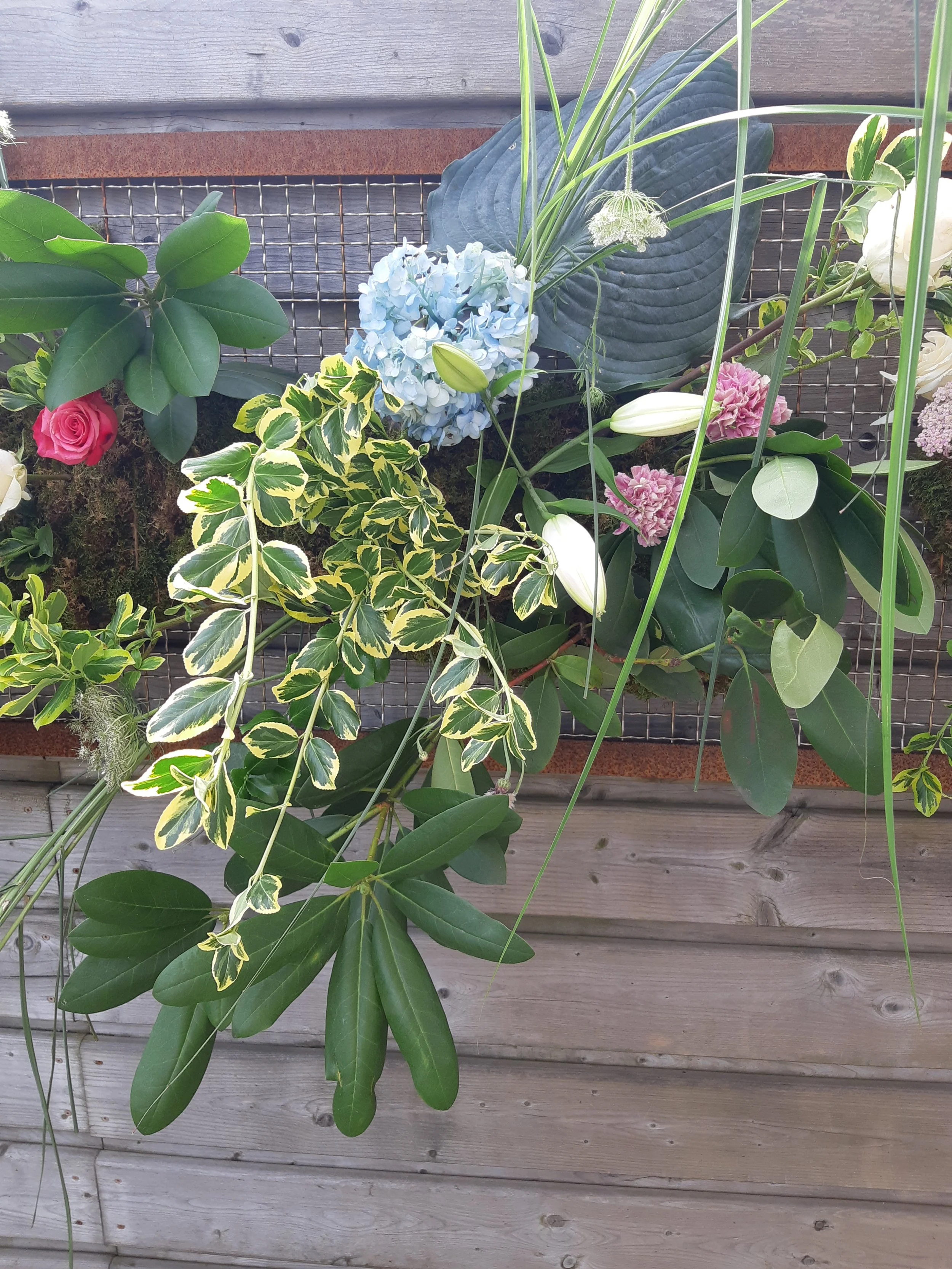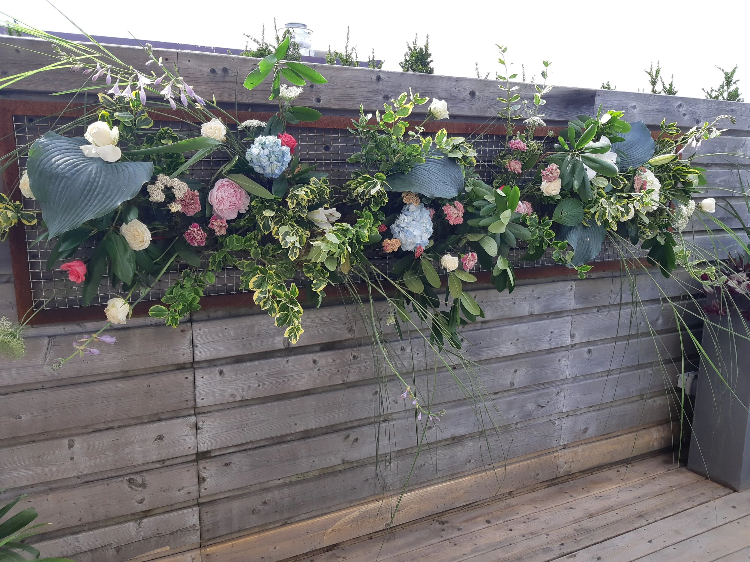 Green Foundation - With the moss base in place, the screens were hung up so I could assemble the flowers in situ, working from largest leaves and flowers to finest. I also considered that the table arrangements and people that would be standing around the deck during the wedding.