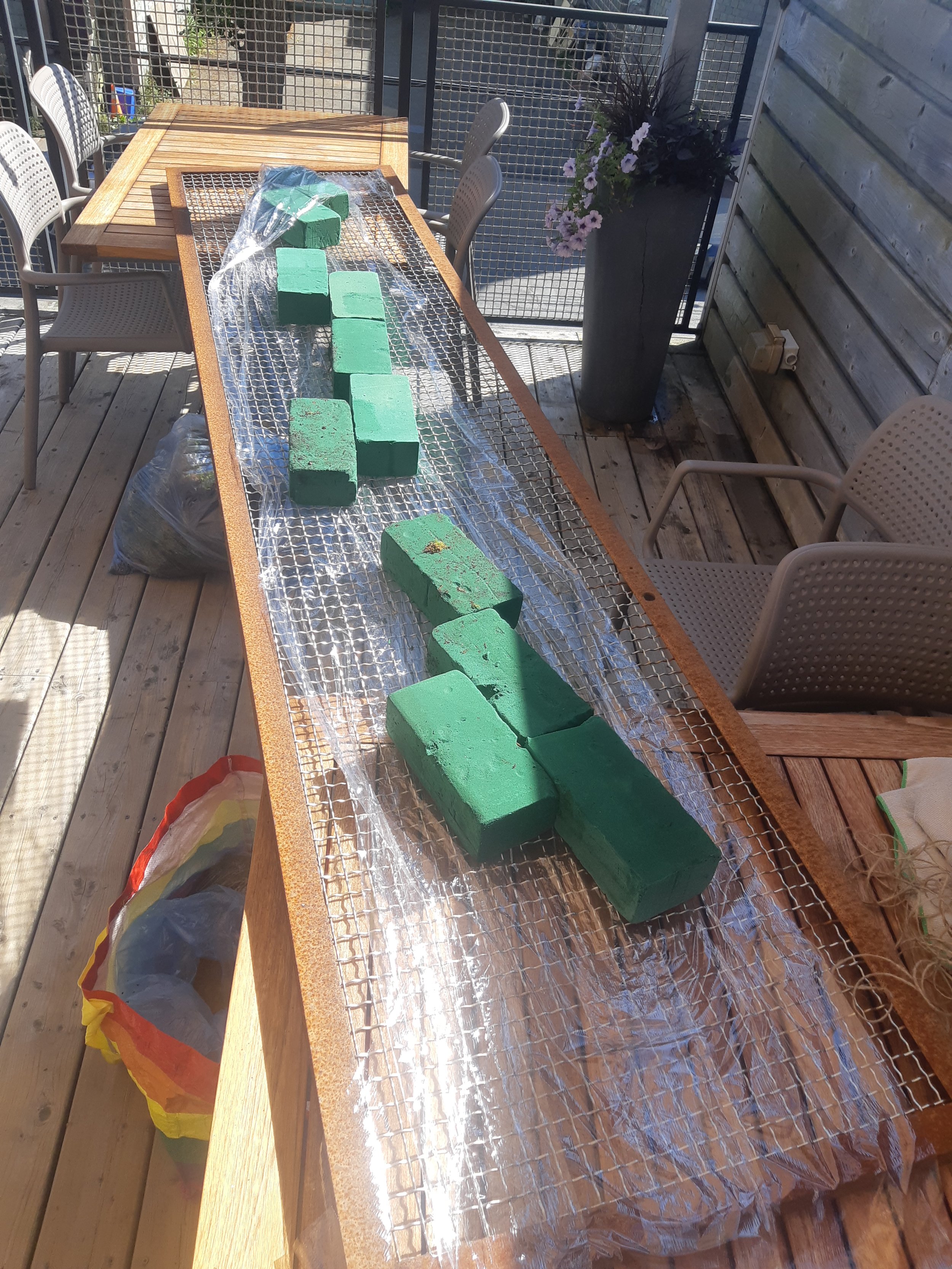 Base Backdrop - Wet oasis floral foam was wrapped in plastic film and lashed to the metal screens.