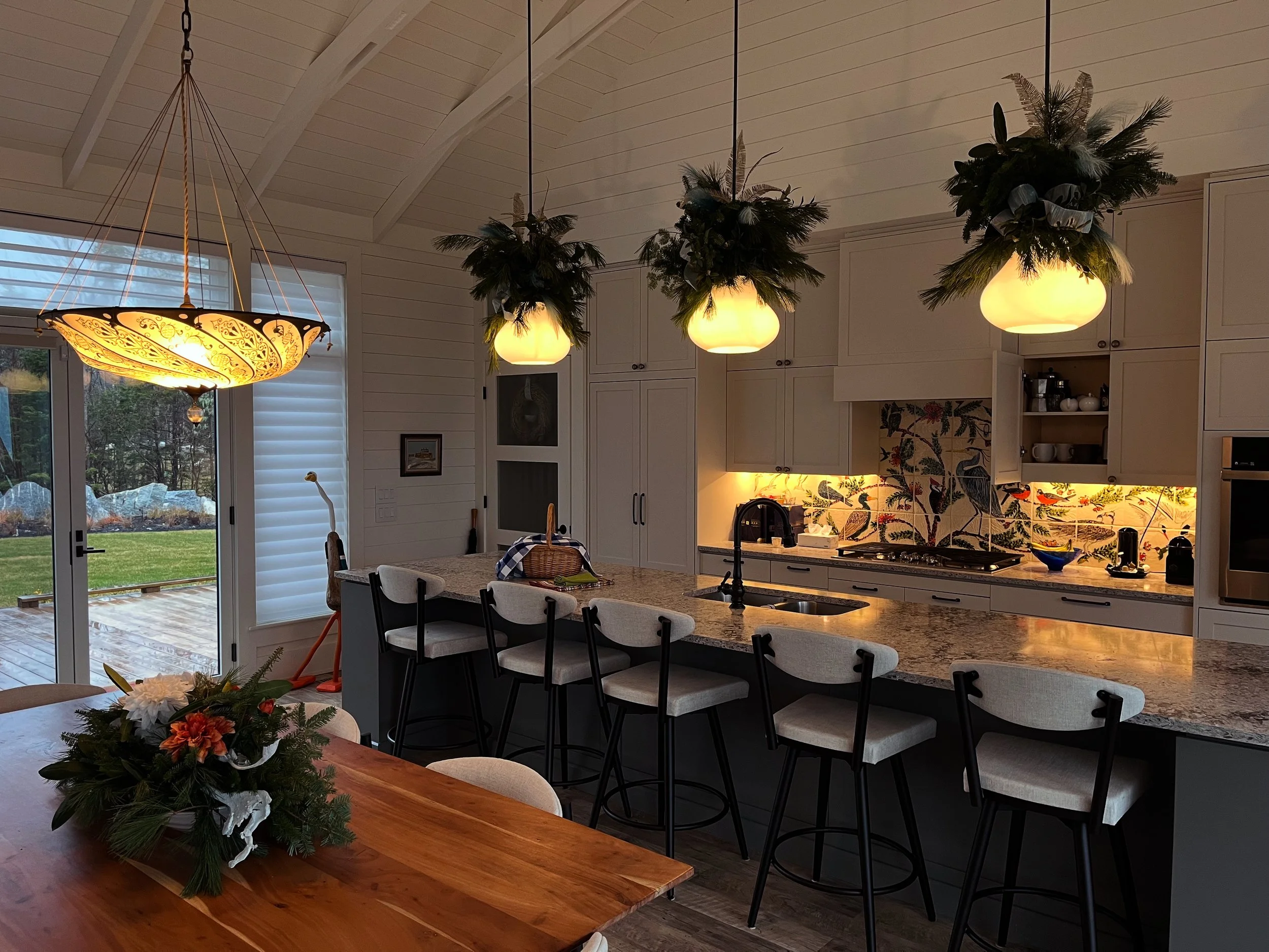 Pretty Pendants - The island lights got dressed in fresh greens, gold and feathers echoing the hand-painted tile in the kitchen backsplash.